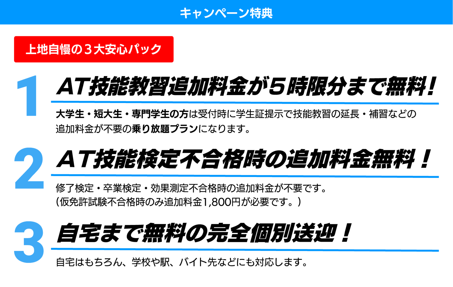 2025年10月1日~2025年12月29日までに普通免許取得コースで入校していただくと下記の特典が付いてとってもお得に免許が取得できます!